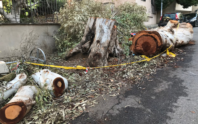Per quanto riguarda la commessa del lavoro di abbattimento, come Cittadini e come Comitato chiediamo inoltre spiegazioni dai soggetti in indirizzo di come sia possibile formulare una commessa di lavoro di abbattimento senza avere una contestuale commessa dell’asporto dei rocchi di eucalipto dalla carreggiata. Per essere chiari non accatastati, in qualche modo, sul marciapiede ma, per la pesantezza, restati sulla carreggiata dove passano in velocità le auto!