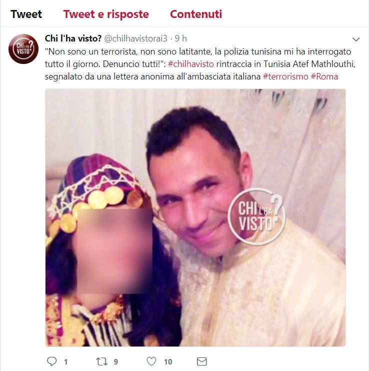 Così Atef Mathlouthi, il tunisino ricercato da ieri per una segnalazione su possibili attentati a Roma, ha dichiarato a “Chi l’ha visto?” che l’ha rintracciato in Tunisia.