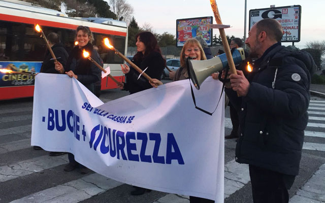 Srotolano uno striscione, accendono le fiaccole e una voce dal megafono supera il rumore del traffico: basta buche!” e ancora “basta buche sulla Cassia!” Il discorso si fa serio.