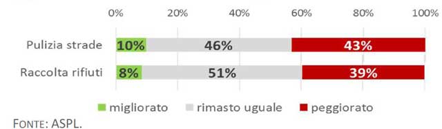 Alla domanda sul recente andamento dei servizi di pulizia e raccolta, la risposta più frequente è che entrambi sono rimasti sostanzialmente invariati. Fra quelli che hanno preso una posizione netta, prevalgono però coloro che denunciano un peggioramento, sia per la pulizia (43%), sia per la raccolta dei rifiuti (39%).