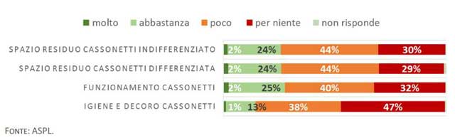 Anche sulle domande specifiche, sottolinea il report, “si nota una insoddisfazione di fondo che porta ad un appiattimento dei giudizi verso il basso. Se infatti il decoro emerge come la massima criticità anche dai monitoraggi della qualità erogata, se lo spazio residuo dell’indifferenziato non raggiunge pienamente gli obiettivi, lo spazio residuo riscontrato per alcune differenziate (organico e vetro) è ottimale e ci si aspetterebbe forse un giudizio più attenuato da parte dei cittadini. Questa considerazione è ancora più forte nel caso del funzionamento dei cassonetti”.