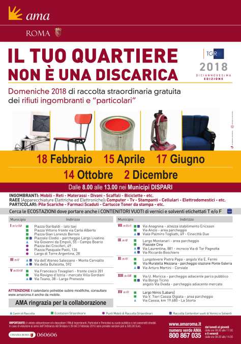 Domenica 15 aprile, nuovo appuntamento nei municipi dispari con la campagna Ama – TGR Lazio “Il Tuo quartiere non è una discarica”, raccolta straordinaria gratuita dei rifiuti ingombranti, elettrici ed elettronici giunta alla diciannovesima edizione.
