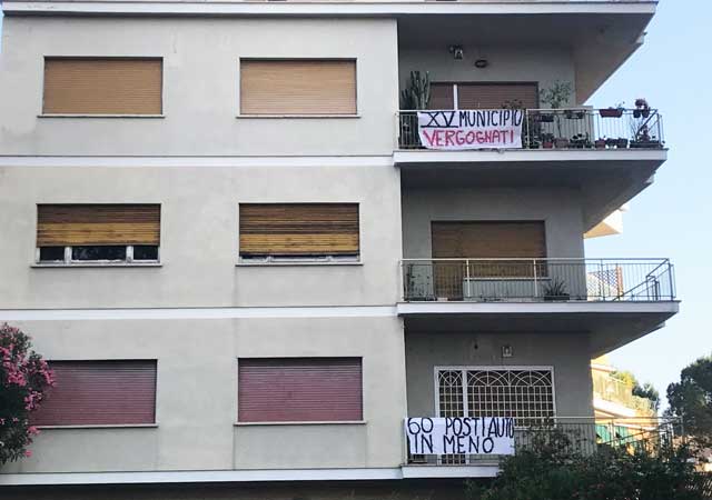 Municipio Vergognati, 60 posti auto in meno” sono le scritte che campeggiano sui balconi mentre si discute animatamente sulla strada e vengono ricordate le quattro diverse soluzioni alternative elaborate dai cittadini e sottoposte al Municipio senza che ne venisse apprezzata una.