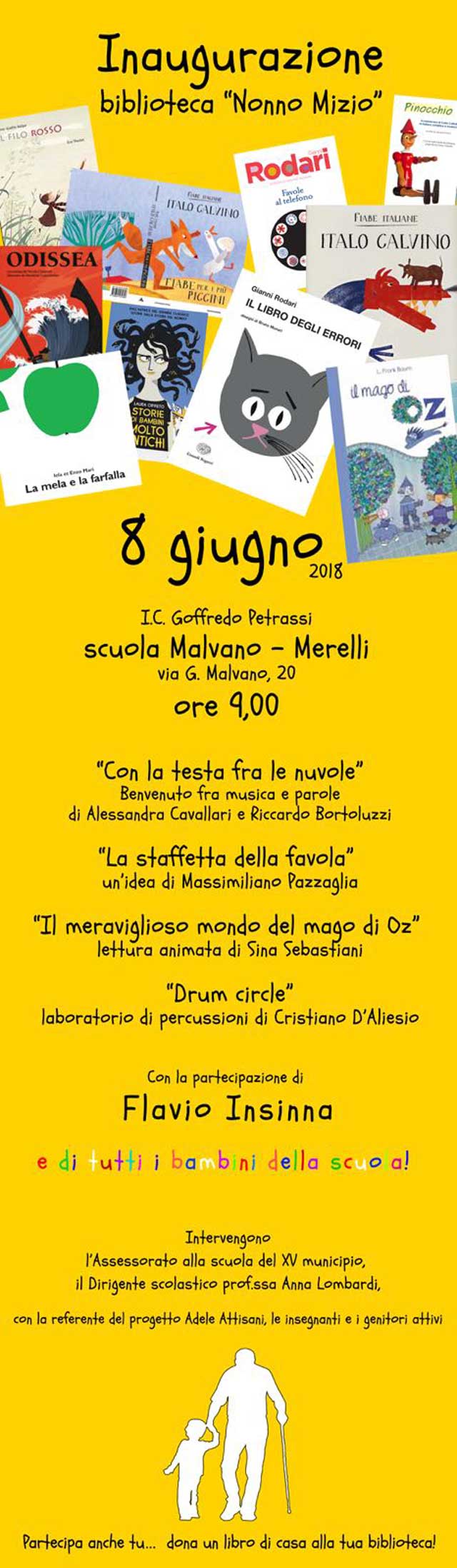 Venerdì 8 giugno, ultimo giorno di scuola, alla Malvano verrà inaugurata la biblioteca scolastica intitolata “Nonno Mizio”. Un successo di cui beneficeranno gli alunni alla ripresa delle attività scolastiche e per festeggiare il quale si terrà un evento con piccoli, nonni, genitori e insegnanti al quale parteciperanno l’attore e conduttore televisivo Flavio Insinna e l’assessore alla scuola del Municipio XV Pasquale Russo. Appuntamento alle 9 in via Malvano 20.
