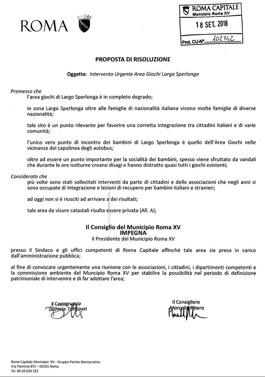 “Oggi abbiamo presentato un atto, che porteremo fuori sacco domani in Consiglio municipale, per porre fine allo stato di abbandono dell’area giochi di Largo Sperlonga. Con l’atto chiediamo la definizione patrimoniale dell’area, ma anche degli interventi di riqualificazione. Nonché la possibilità anche per i volontari di occuparsene. La sicurezza dei territori e l’integrazione sociale passano anche per la riqualificazione e il decoro dei beni comuni: per questo speriamo che l’Aula di via Flaminia discuta il testo e lo voti favorevolmente”. Così in una nota i Consiglieri PD del Municipio XV Daniele Torquati e Marcello Ribera