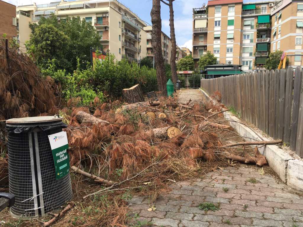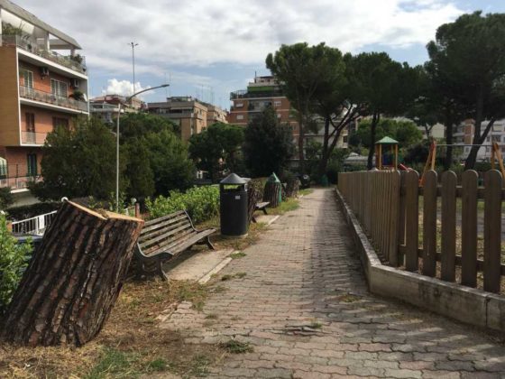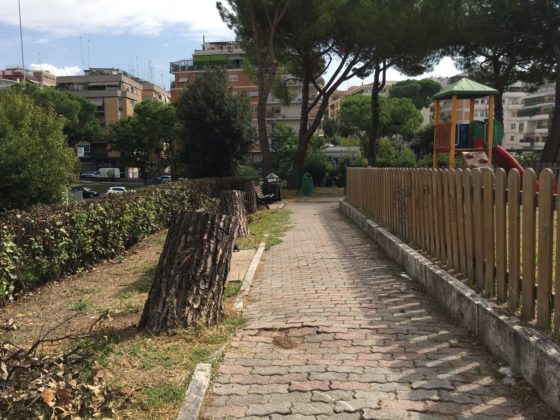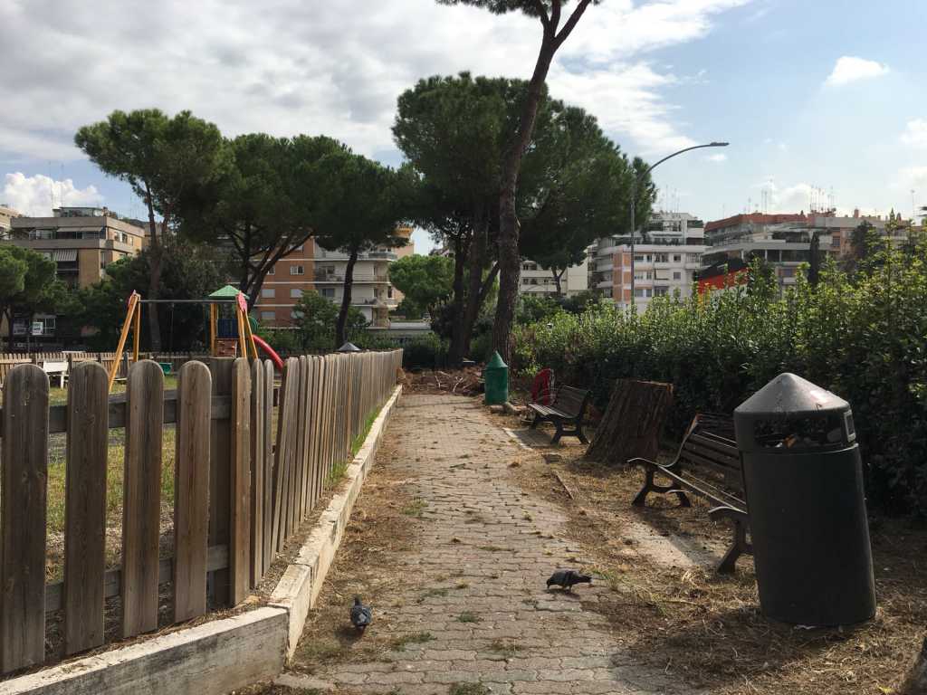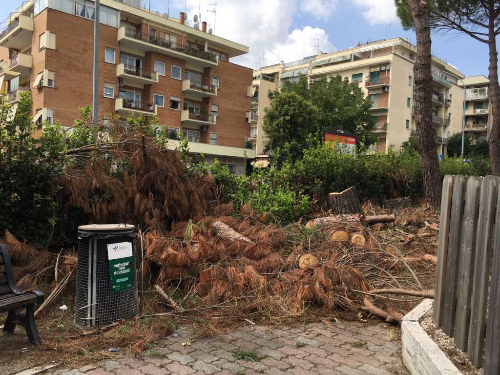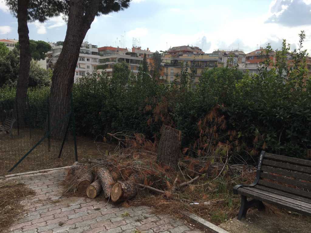 Ad oggi i pini sono stati tagliati – “Ne hanno abbattuti quattordici. Al posto dei tronchi l’assessore all’Ambiente del XV Municipio ci ha promesso dieci tigli” – ma i loro resti sono stati abbandonati nel piccolo giardino ormai dominato dal degrado e dall’incuria. “I lavori dovevano terminare il 28 luglio – sottolinea Casani – ma dopo un mese e mezzo il parco non è ancora stato aperto”.