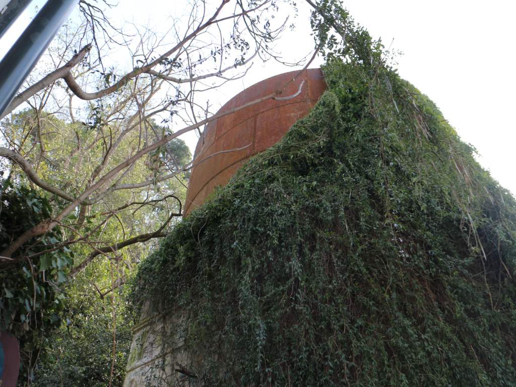In un angolo, accanto ad una casetta, c’è un vecchio serbatoio dell’acqua; la base in muratura è a spigoli mentre la cisterna superiore è stata realizzata con piastre metalliche imbullonate. Un piccolo esempio di architettura industriale: altrove lo si sarebbe sistemato per farne magari un chiosco, una struttura pubblicitaria oppure niente, giusto per farlo vedere. Da noi, no.