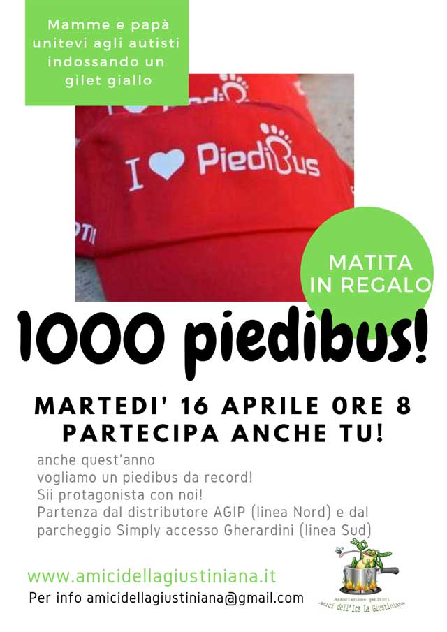 Dopo il grande successo dello scorso anno scorso l’Associazione Genitori Amici dell’ICS La Giustiniana ha organizzato per martedì 16 aprile la seconda edizione del “MillePiedibus“, una giornata speciale nel corso della quale tutti, ma proprio tutti, i bambini della scuola primaria dell’ICS La Giustiniana sono invitati a venire a scuola a piedi.