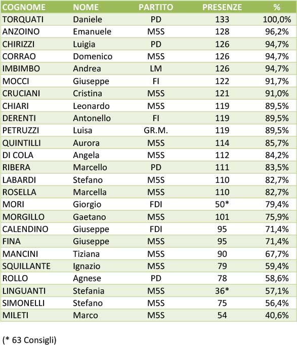 133 sono state le sedute Consiglio tenutesi da luglio 2016 a giugno 2019 e la graduatoria che ha portato a questi risultati è basata sul numero di presenze di ciascun consigliere.