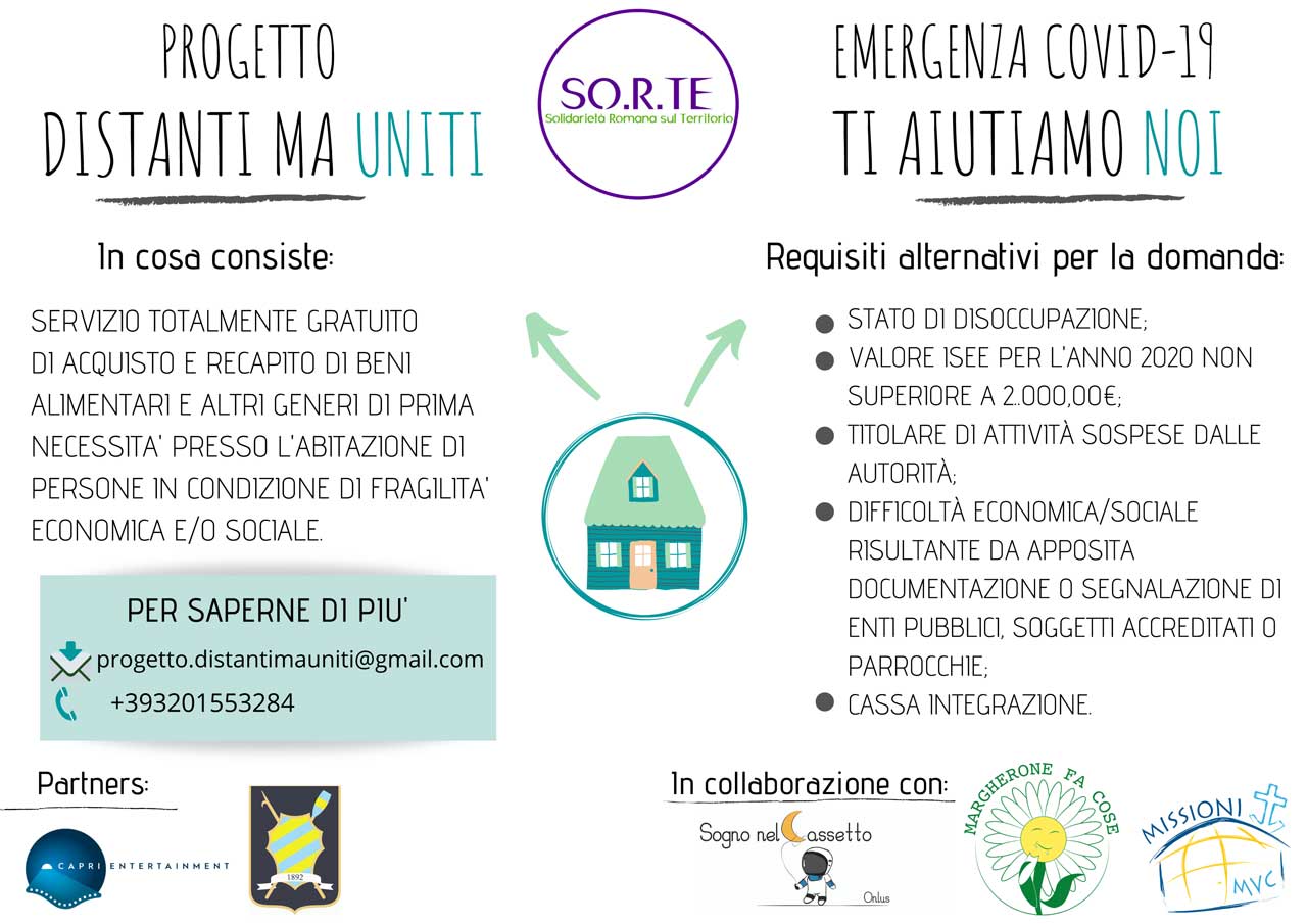 I Volontari dell’Associazione di promozione sociale “Solidarietà Romana sul Territorio – SO.R.TE.” in collaborazione con i Volontari delle ONLUS “Margherone Fa Cose”, “Sogno nel Cassetto” e “Missioni MVC” uniscono le loro forze ponendosi al servizio delle famiglie più bisognose.