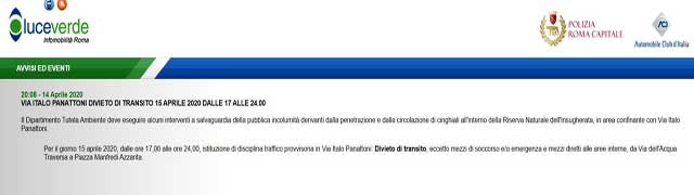 Il motivo lo si apprende da un avviso di poche righe pubblicato nella serata di ieri sul sito LuceVerde, gestito dalla Polizia Locale di Roma. A quanto si legge, in via Panattoni il Dipartimento capitolino all’Ambiente “deve eseguire alcuni interventi a salvaguardia della pubblica incolumità derivanti dalla penetrazione e dalla circolazione di cinghiali all’interno della Riserva Naturale dell’Insugherata, in area confinante con Via Italo Panattoni“.