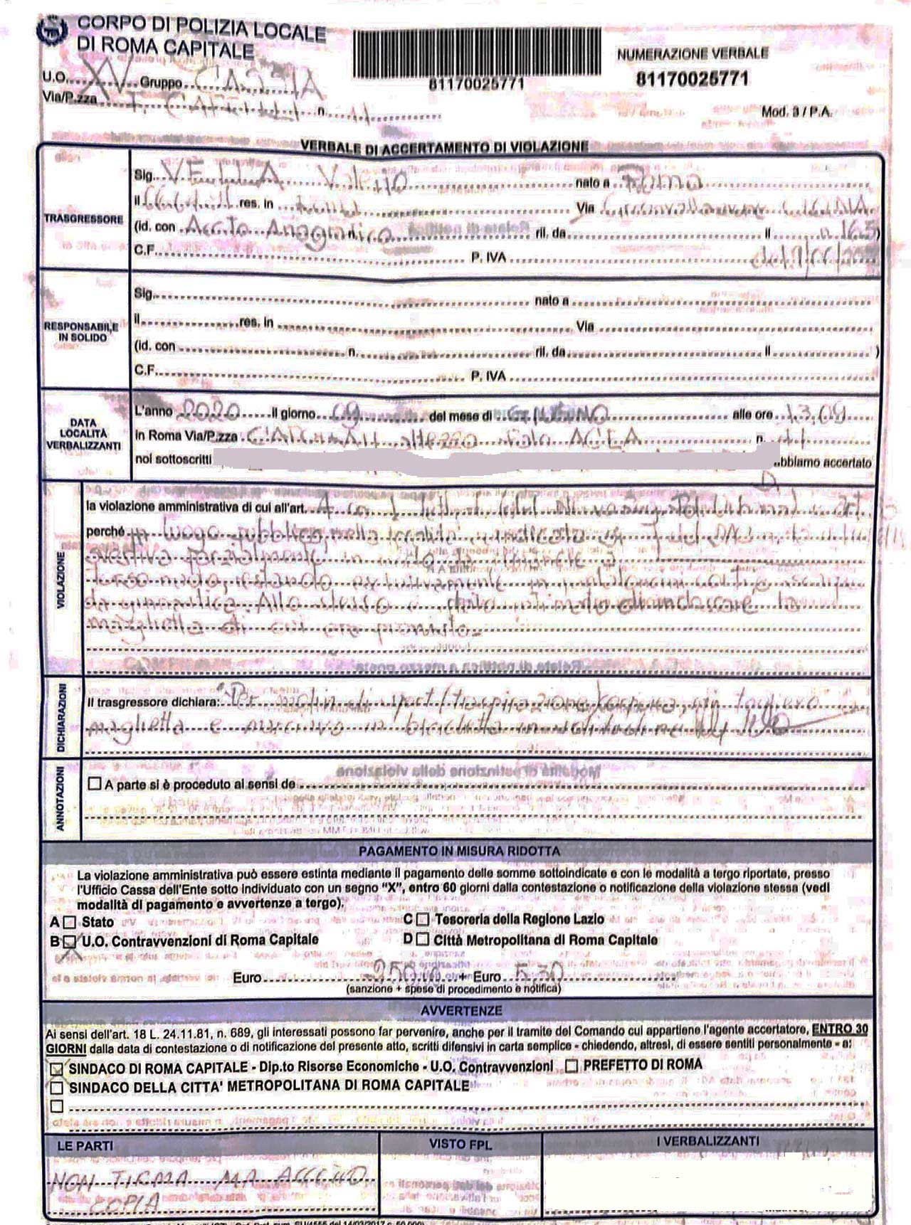 “In pochi secondi venivo accerchiato da una pattuglia della Polizia Municipale XV Gruppo Cassia che provvedeva a redigere un verbale multandomi al pagamento di euro 250 contestandomi la violazione dell’articolo sul pubblico decoro”.