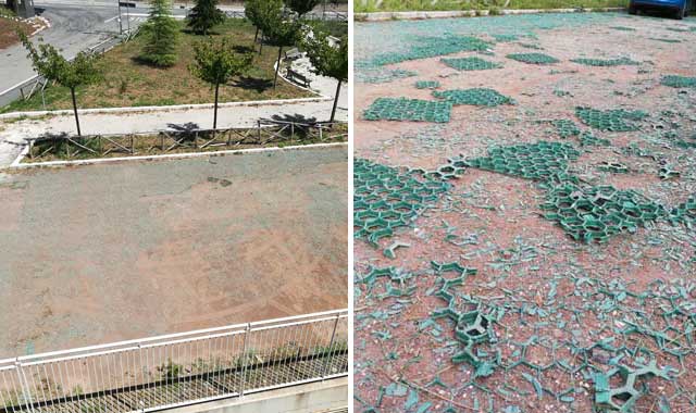 Terreno di proprietà comunale confinante con il suddetto giardino e adibito a parcheggio pubblico. “Come si noterà dalle foto, è stato realizzato in terra battuta, inoltre non è in piano ma leggermente scosceso perché segue l’inclinazione della strada con cui confina da un lato. Ragion per cui, quando piove, l’acqua piovana trascina con sé, verso il manto stradale, la terra di cui è composto ma soprattutto una considerevole quantità di frammenti di plastica di colore verde, frutto di una pavimentazione in plastica, posizionata all’epoca dal costruttore dell’intera area, ma che nel corso degli anni è andata via via sgretolandosi” sottolinea puntualmente Francesco nell’allegare due foto a dimostrazione di quanto afferma.