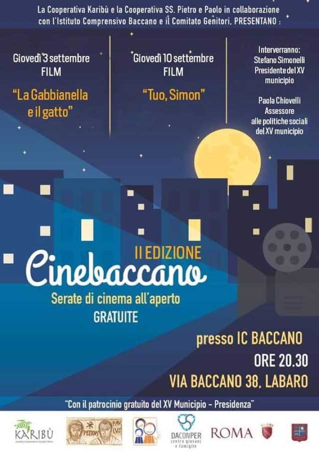 Dopo la prima e fortunata edizione 2019, i prossimi giovedì 3 e 10 settembre a Labaro torna l’evento Cinebaccano, due serate di cinema all’aperto gratuito nel piazzale esterno dell’IC Baccano, la prima scuola plastic free di Roma ubicata in via Baccano 38.