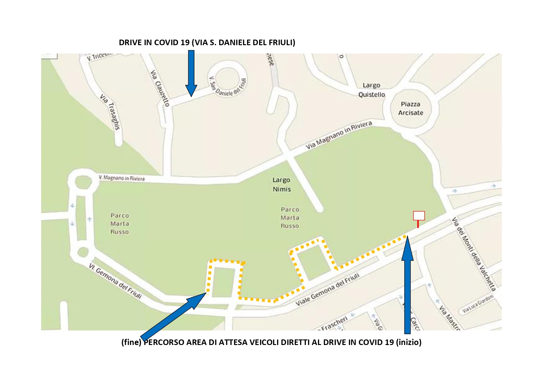 Scrive infatti il minisindaco dicendo che “Come anticipato nei giorni scorsi, al fine di mitigare l’impatto del cospicuo afflusso di veicoli diretti al Drive In Covid-19 sito in via San Daniele del Friuli, si è individuata un’area, limitrofa ma meno antropizzata, dove decentrare il punto di attesa dei veicoli. Da ieri mattina imprese incaricate dal Municipio XV stanno provvedendo ad apporre new jersey in plastica e recinzioni in metallo nonché la segnaletica orizzontale (di colore giallo) e verticale utile a definire l’area di attesa dei veicoli e il relativo percorso che dovranno seguire i cittadini”.