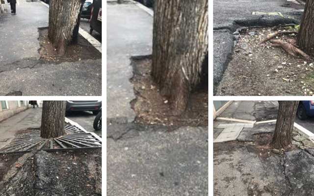Definirlo ammalorato è un eufemismo, “sgarrupato” rende meglio l’idea. Cento metri di percorso ad ostacoli fra radici di alberi, ghiere rialzate di quattro-cinque centimetri e buche traditrici. Questo è il marciapiede sul lato sinistro di via Flaminia, nel tratto compreso fra Piazzale Ponte Milvio e via Bolsena.
