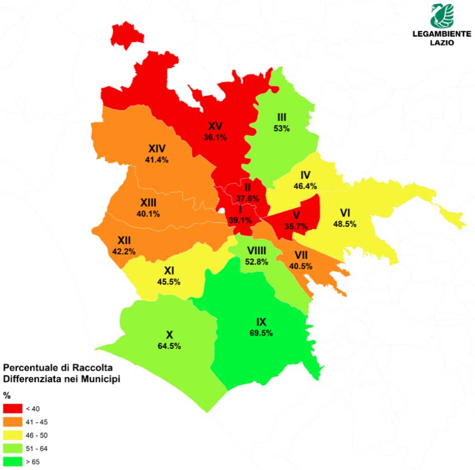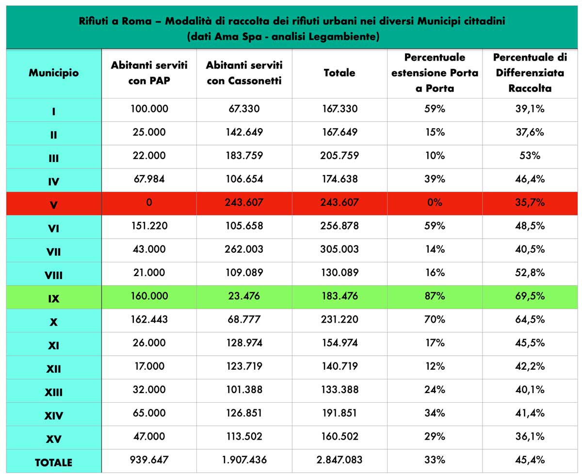 Secondo i dati più recenti, fonte Ama, il miglior municipio in % di Differenziata è il IX con il 69%, guarda caso lo stesso con il record di utenze Porta a Porta diffuse a 87% della cittadinanza, gli altri hanno risultati pessimi e il V Municipio è il peggior per differenziata al 35,7%, proprio il peggiore per estensione del PaP, con zero utenze Porta a Porta.