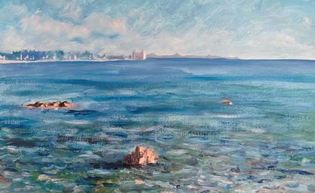 Tra le onde scorgiamo le rocce e le tipiche palafitte di Santa Marinella, i surfisti di Banzai, le sabbie nere e l’antico castello di Santa Severa. Per lui il mare è stato una straordinaria scoperta: “Conoscevo queste località, ma non avevo mai dipinto il mare, perché mi sono sempre concentrato su altro. Ora ne sono innamorato ed è una piacevole sfida ritrarre i suoi umori, colori ed effetti”.