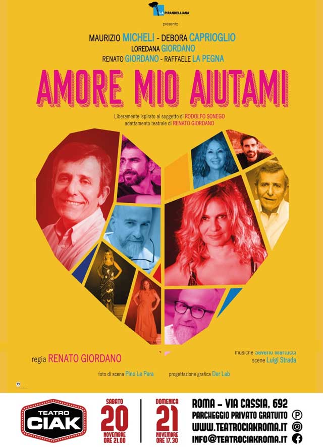Presentato da La Pirandelliana, diretto da Renato Giordano e interpretato da Maurizio Micheli e Debora Caprioglio, “Amore mio aiutami” sarà in scena sabato 20 (con inizio alle ore 21) e domenica 21 novembre (ore 17.30).