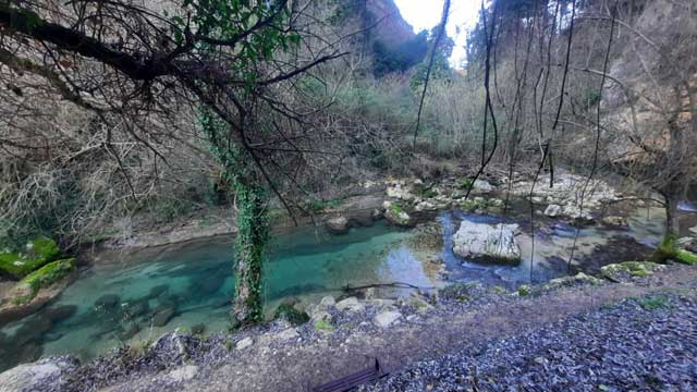 L’inverno tiene lontane le comitive chiassose e le musiche a volume impossibile; un silenzio “gelido” nel vero senso della parola avvolge come un sudario il fiume e le sponde verdeggianti dove imponenti guglie di pietra sovrastano il fiume.