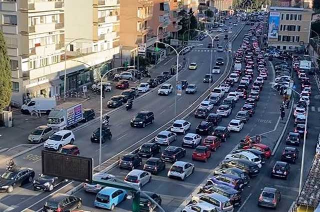 Corso Francia è interamente bloccato dalle auto. In direzione centro città, la circolazione viene canalizzata  su una sola corsia mentre nella carreggiata opposta una corsia è occupata dai mezzi di soccorso.