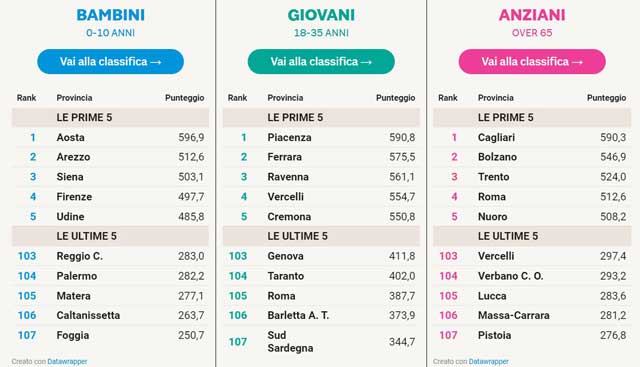 31 gli indicatori presi in considerazione: per i bambini la percentuale di edifici scolastici, il numero di posti nido e il verde attrezzato. Per i giovani le imprese e il numero dei disoccupati mentre per gli anziani l’assistenza sanitaria.