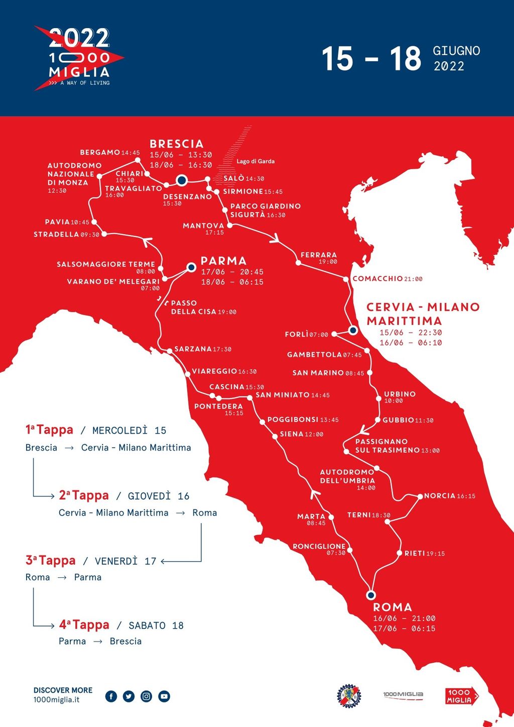 A dodici mesi da una versione il cui percorso ha ripreso la direzione antioraria delle 1000 Miglia anteguerra, dal 1927 al 1938, si torna al tracciato che ha caratterizzato le edizioni del 1947 e 1948 e le successive dal 1950 al 1957, oltre le trentotto rievocazioni su trentanove.