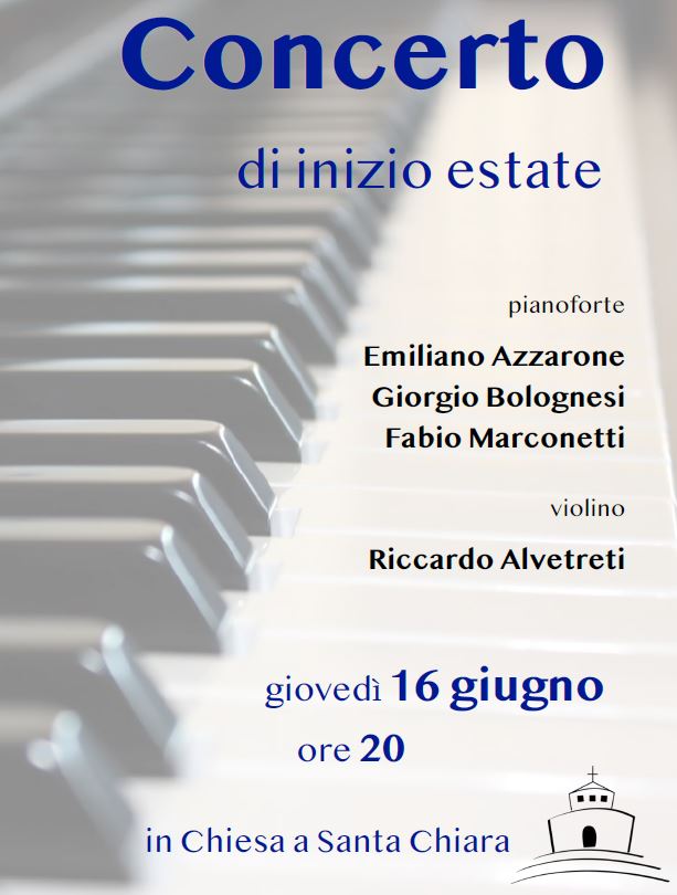 Giovedì 16 giugno, con inizio alle 20, nella chiesa di Santa Chiara – piazza dei Giochi Delfici – si terrà un concerto di giovani studenti del Conservatorio di Musica.