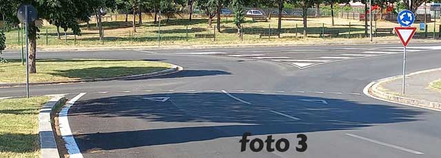 Tanto per avere un confronto, Giovanni ricorda che appena qualche decina di metri più avanti (foto 3) c’è una “vera” rotonda con la sua segnaletica regolare, tre frecce poste in circolo su sfondo blu e segnale triangolare dare la precedenza.