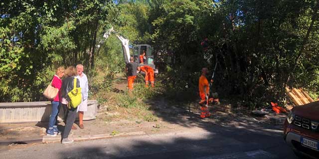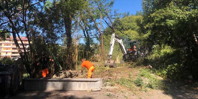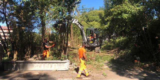 Nella giornata di venerdì 23 settembre, armata di ruspa e motoseghe, Ama ha proceduto allo sfalcio della vegetazione, allo sradicamento dei rovi, alla potatura degli alberi e alla pulizia di una porzione dell’area, quella subito confinante con l’area cani di via Valdagno. Ma è solo l’inizio.