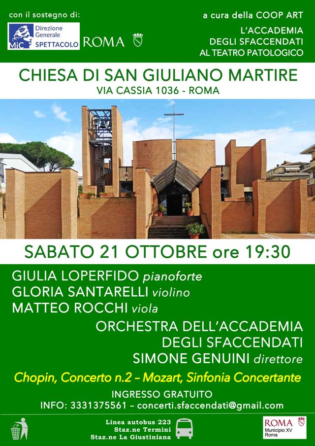 Il Progetto, realizzato in collaborazione col XV Municipio e grazie alla sensibilità del Parroco Don Massimo De Propris, presenta nella Chiesa di San Giuliano Martire una impegnativa produzione musicale che consiste nella esecuzione di un programma artistico: il Concerto n.2 in fa minore op.21 per pianoforte e orchestra di Chopin insieme alla Sinfonia Concertante per violino, viola e orchestra K364 di Mozart.