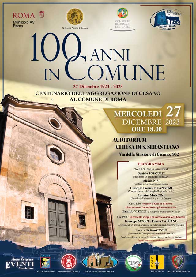 Mercoledì 27 dicembre, a partire dalle 18, nell’auditorium della Chiesa di San Sebastiano di Cesano (via della stazione di Cesano 402), in occasione del centenario, si terrà la rievocazione dello scorporo di Cesano dal Comune di Campagnano e contestuale annessione a quello di Roma, condizioni sancite con Regio Decreto 27 dicembre 1923, n. 3247.
