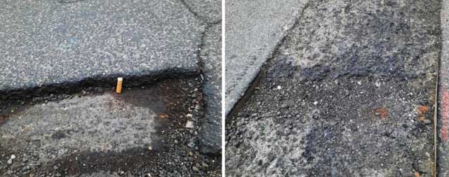 In effetti, l’asfalto a copertura della trincea presenta numerosi avvallamenti, buche e angoli vivi di qualche centimetro. Per rendere l’idea dello scalino abbiamo poggiato un mozzicone di sigaretta (3-4 cm) sullo spigolo prima di fotografarlo; pur non essendo degli esperti ci è sembrato che il lavoro non sia stato proprio fatto alla perfezione.
