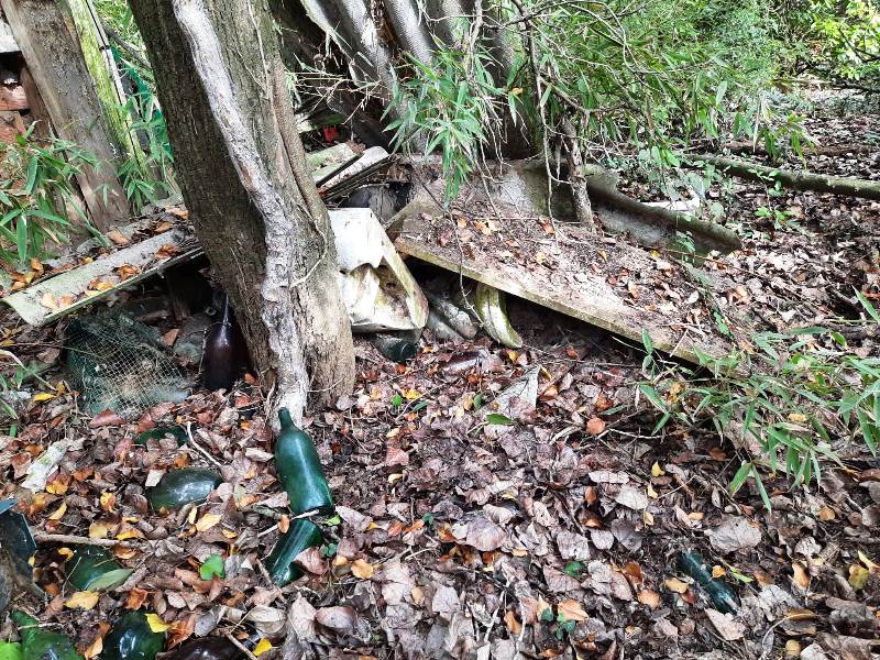 Tra la vegetazione disordinata, gli alberi abbattuti e i rovi ci sono cumuli di rifiuti, di detriti, calcinacci, vecchi sanitari e centinaia di bottiglie vuote.