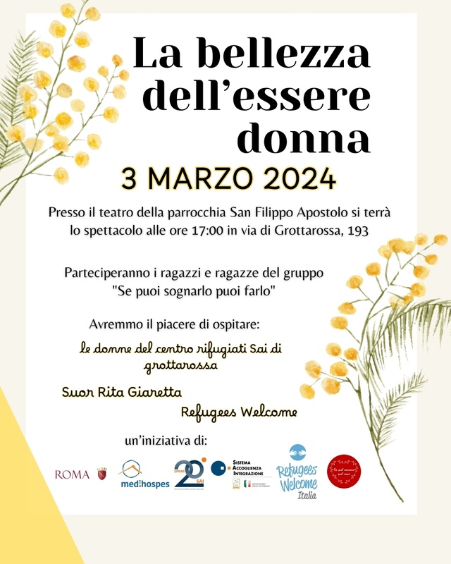 Domenica 3 marzo, alle 17, nel teatro della parrocchia San Filippo Apostolo – via di Grottarossa 193 – si terrà lo spettacolo “La bellezze dell’essere donna” con la partecipazione dei ragazzi e delle ragazze del gruppo “Se puoi sognarlo puoi farlo”.