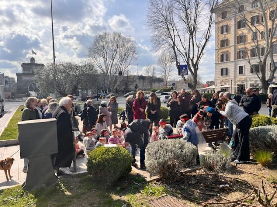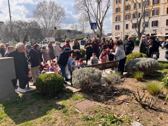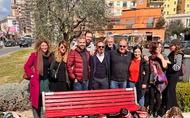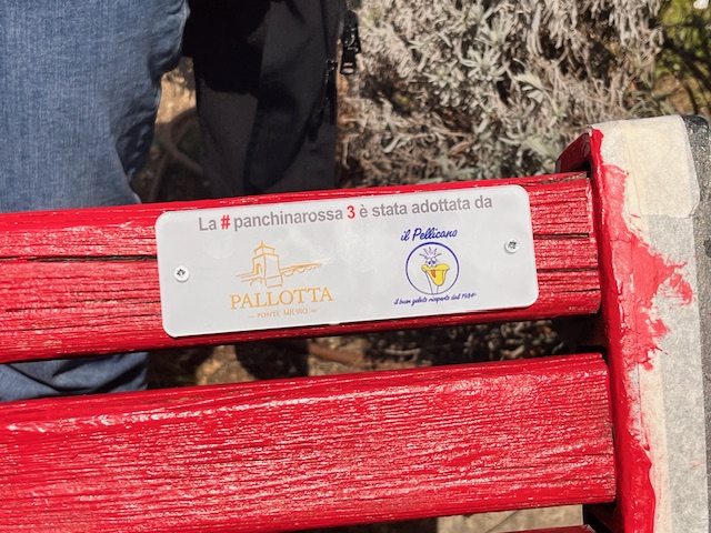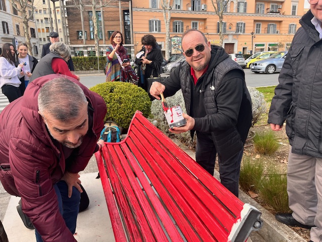 Adottata da due dei pubblici esercizi storici di Ponte Milvio, il Bar Pallotta e la gelateria il Pellicano (adozione significa che se ne prenderanno cura), la panchina è stata dipinta di rosso dai bambini della locale scuola dell’Infanzia Merelli e inaugurata dai vertici del Municipio XV. Erano infatti presenti il Presidente Daniele Torquati e il Vicepresidente Alessandro Cozza con Agnese Rollo, Assessora alle Pari Opportunità, e Tatiana Marchisio, Assessora alla Scuola.