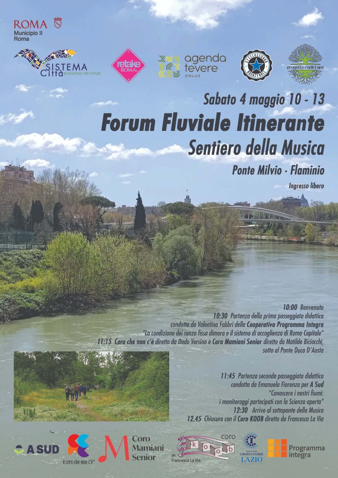Il primo Forum Fluviale Itinerante sul Sentiero della Musica, da Ponte Milvio al Ponte della Musica – un progetto ideato, organizzato e promosso da Sistema Città – si terrà sabato 4 maggio, dalle 10 alle 13, con due passeggiate didattiche e due momenti musicali.