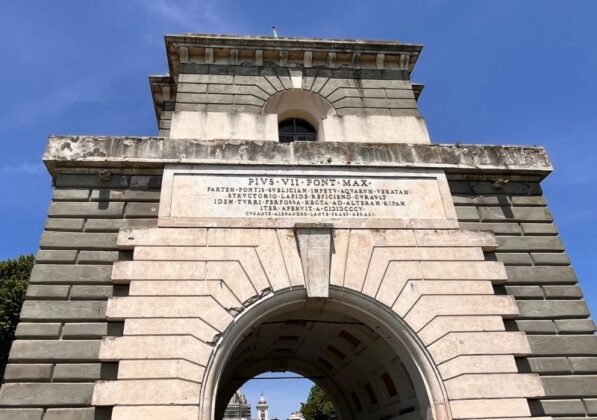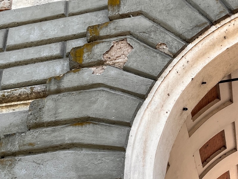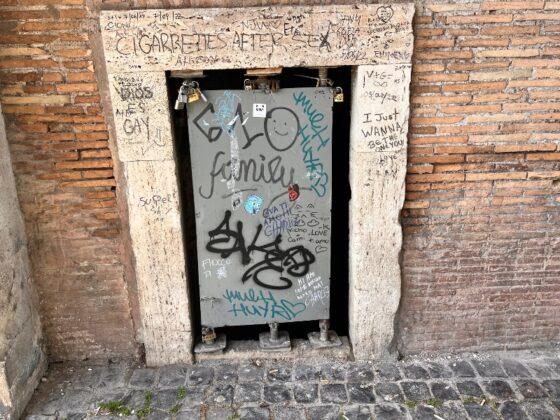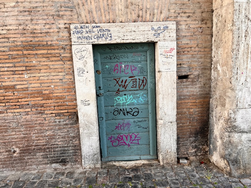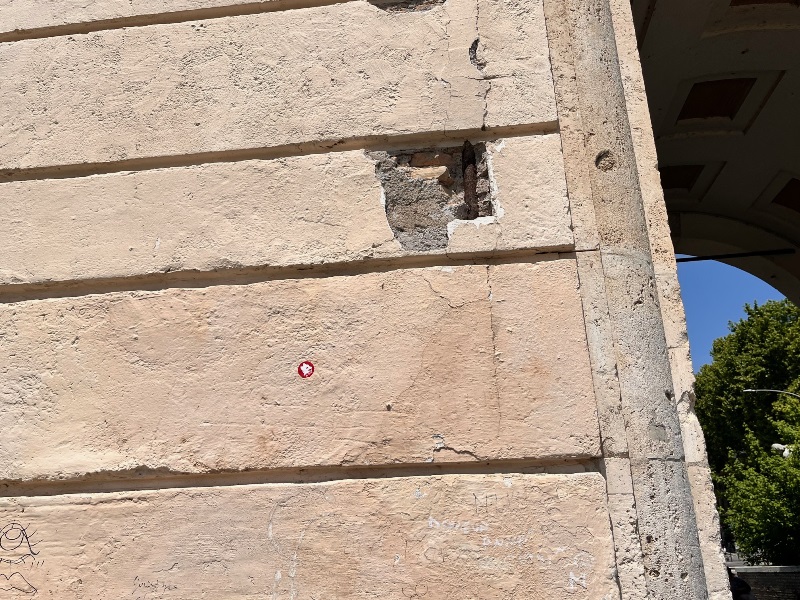 Ma non è tutto, perché sotto le arcate della Torretta le scritte imbrattano anche tre delle quattro porticine; la quarta in realtà non c’è più, sostituita da una lastra di metallo alla faccia del rispetto dovuto al Valadier. Per non parlare poi dei muri scrostati, dei buchi sulle pareti, dei cornicioni ammalorati dove spadroneggia la muffa.