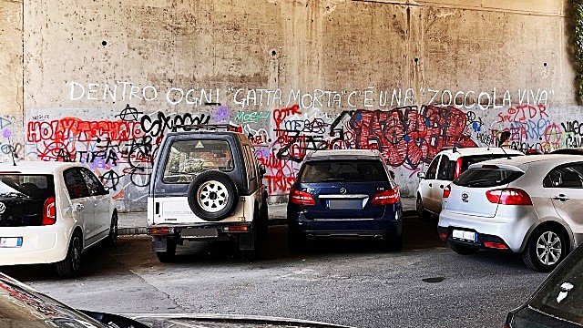 Da almeno dieci anni, una lunga scritta presente  in via della Farnesina, sotto il ponte dell’Olimpica, così recitava: “in ogni gatta morta c’è una zoccola viva”. Il graffito era diventato un’icona, per alcuni un po’ misogina e irriverente, per altri una canagliata, ma divertente.