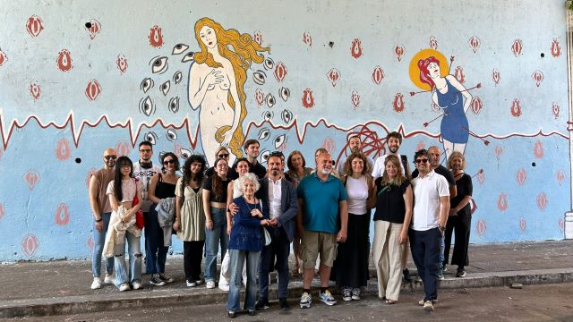 “Al suo posto oggi c’è il grande murale degli allievi dell’Accademia di Belle Arti di Roma che guidati dall’artista Maupal hanno reso omaggio alle donne con un’opera opposta alla scritta. Questo è il potere dell’arte e dei giovani, – conclude Torquati (qui in una foto di gruppo) – saper trasformare e migliorare gli spazi urbani”.