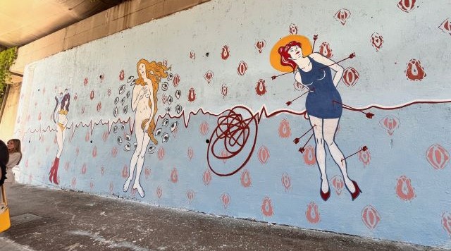 E poi Roberta: “ho visto in questi giorni un gruppo di volenterose ragazze in azione per ridipingere il sottopasso del cavalcavia della tangenziale. Stanno dipingendo un bel murale di figure femminili fondamentali dove per anni ha trionfato la scritta “Dentro una gatta morta c’è una zoccola viva” ….spiritosa forse ma mica tanto… evviva le ragazze!”