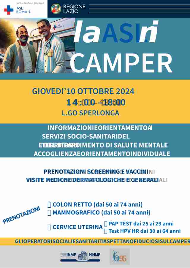 Prossima tappa Largo Sperlonga, giovedì 10 ottobre dove gli operatori saranno a disposizione dalle 14 alle 18 per visite, consulenze, screening e orientamento socio-sanitario. Il loro obiettivo è raggiungere primariamente persone vulnerabili o con fragilità socio-sanitaria residenti, non residenti o irregolari che hanno difficoltà diverse di accesso ai servizi socio-sanitari, inclusi quelli amministrativi.