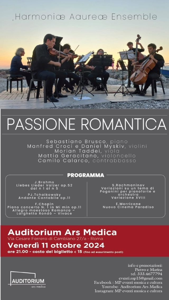 Venerdì 11 ottobre, all’Auditorium Ars Medica in via Cesare Ferrero di Cambiano 27, l’Harmoniae Aureae Ensemble presenta alle 21 “Passione romantica”, con Sebastiano Brusco al piano, Manfred Croci e Daniel Myskiv ai violini, Morian Taddei alla viola, Mattia Geracitano al violoncello e Camilo Calarco al contrabbasso.