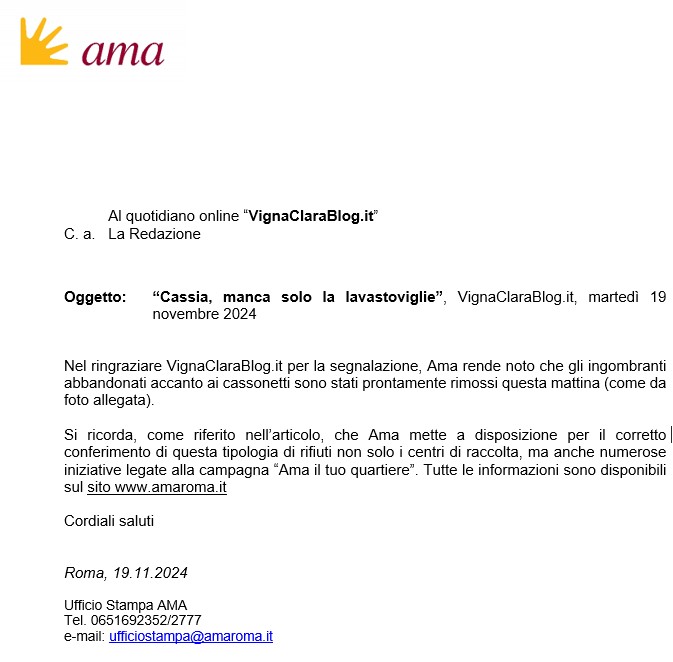 E’ con vero piacere che diamo questa notizia a seguito di una comunicazione odierna alla quale non possiamo che rispondere: grazie AMA.