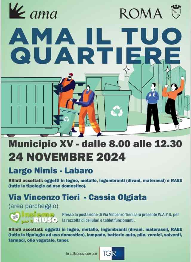 Domenica 24 novembre tornano nel XV Municipio i centri mobili di AMA per la raccolta straordinaria e gratuita dei rifiuti ingombranti. Due i punti di raccolta: a Largo Nimis, a Labaro, e in via Tieri (area parcheggio), a La Storta.