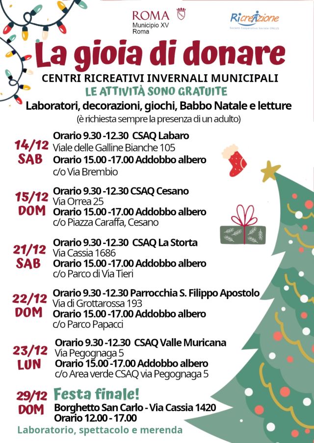 Realizzate con i fondi della Presidenza del Consiglio dei ministri destinati a progetti per i minori, il Municipio XV, con la collaborazione della Cooperativa Ricreazione Onlus, ha organizzato sei giornate di centri ricreativi invernali per bambini che si svolgeranno nei Centri Anziani e nelle parrocchie di diversi quartieri del territorio.