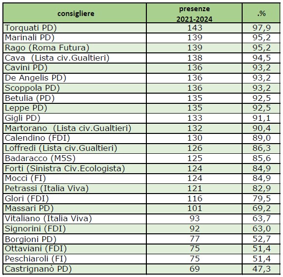 Dalla prima del 3 novembre del 2021 all’ultima del 2024, in questi quattro anni di consiliatura in totale si sono tenute 146 sedute e la maglia rosa di quasi “fine corsa” (le prossime elezioni si terranno a inizio primavera 2027) spetta a Daniele Torquati con 143 presenze.