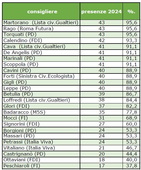 Iniziamo col 2024 e concludiamo con l’intera consiliatura in corso 2021-2024, precisando che nella misurazione è stato preso in considerazione anche il presidente Torquati, componente del Consiglio a tutti gli effetti, mentre gli assessori non lo sono.