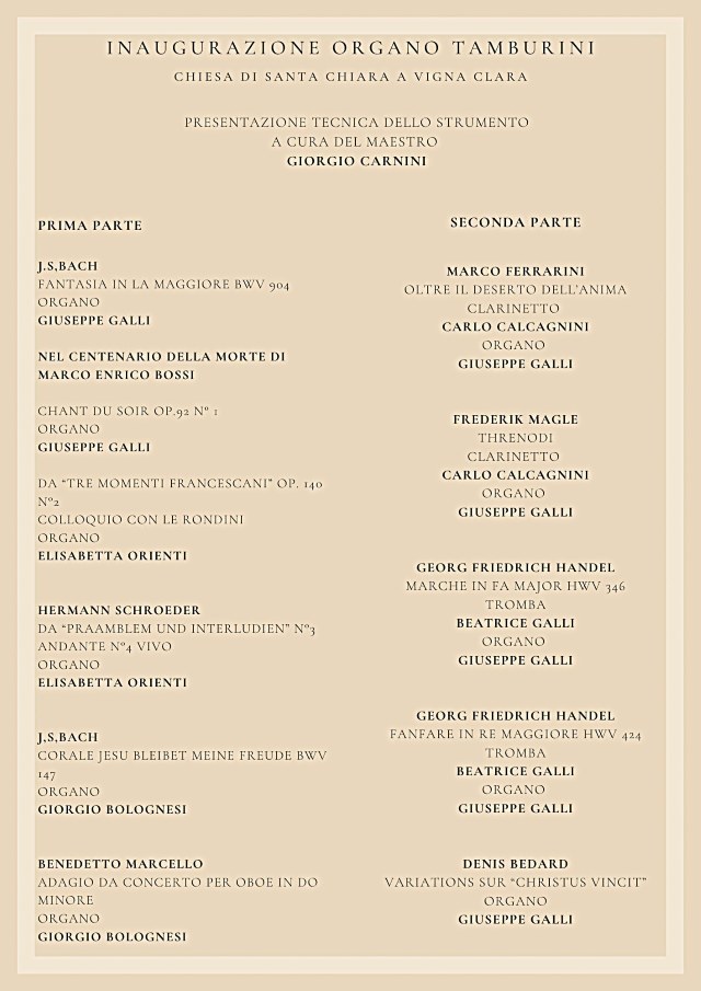 E a noi allora non resterà che il ritrovato piacere di ascoltare musiche stupende nelle mani di grandi maestri e segnarci i prossimi appuntamenti con il nostro super organo di Santa Chiara. Per il momento il primo appuntamento è dunque venerdì 28 febbraio alle 17.30