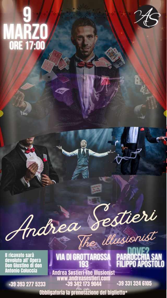 Sul palco ci sarà Andrea Sestieri. Illusionista sulle navi da crociera, finalista di Italia’s Got Talent, ospite e consulente per diversi show televisivi italiani, finalista del campionato italiano di magia, regista e performer di otto diversi one man show teatrali che hanno registrato il tutto esaurito in ogni data.